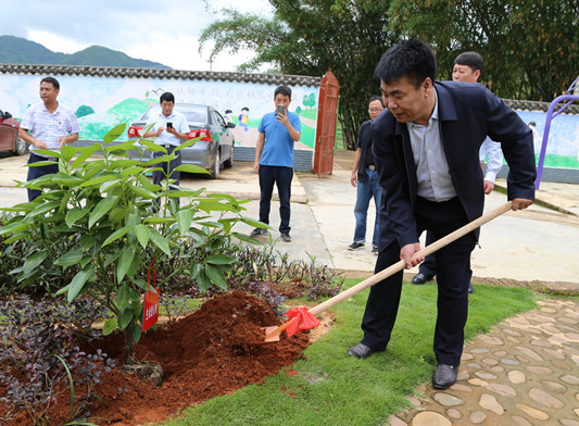 物资捐赠结束,富德生命人寿云南分公司总经理任宝贵在曼连希望小学校园种下象征陪伴和成长的“生命爱心树”。