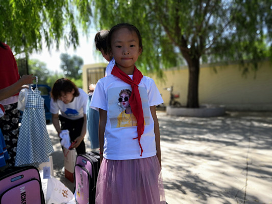 这是2019年“小海豚计划”前期走访对口捐助学校时的情景。小梓萱家庭困难,妈妈是位特殊人士,爸爸一人忙着照顾家里家外。小梓萱瘦瘦小小,大热天还穿着一条破旧的厚裤子,看着让人心疼。见此情景,校长叹了口气,问“小海豚”志愿者能不能帮她选条裙子。志愿者欣然答应。