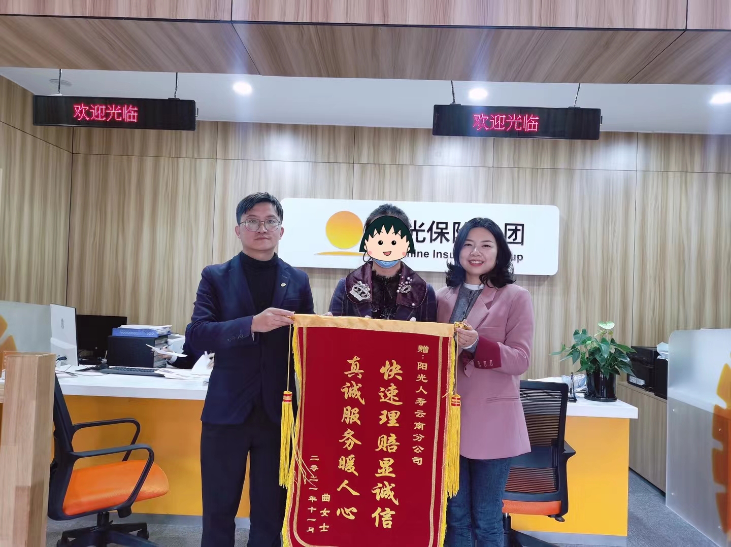 11月15日,曲女士特地向阳光人寿云南分公司送去一面印有“快速理赔显诚信 真诚服务暖人心”的锦旗,对该公司24小时内完成37.5万重疾赔付表达感谢。