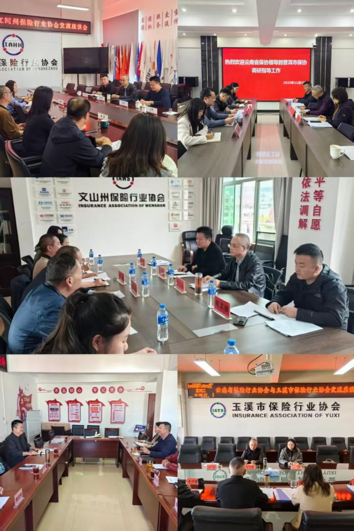 为加强省、州(市)协会联动,打造全省协会一盘棋工作格局,进一步提升全省协会规范化建设水平与服务效能,2025年11月11日-25日,云南省保险行业协会专职副会长李灼铨带队赴红河、文山、楚雄、普洱、玉溪保险行业协会开展交流座谈。