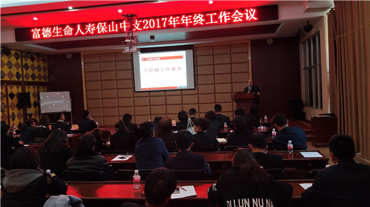 2018年1月9日,富德生命人寿保山中支召开2017年年终工作会议,中支负责人于忠国及全体内外勤员工参会。