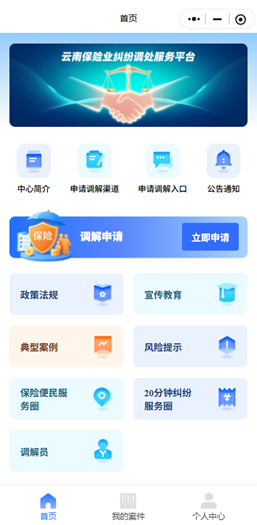 近年来,伴随云南保险业的快速发展,保险纠纷数量呈逐渐增多之势。云南省保险行业协会深入践行“以人民为中心”的服务理念,有效化解保险市场矛盾,营造良好的保险生态。在云南金融监管局的指导下,云南省保险行业协会依托昆明市及盘龙区保险业人民调解委员会打造7×24数字化的调解服务平台。通过小程序服务端和后台管理端的双通道,既能解决人民群众维权难的痛点,又能实现全省保险调解案件的智能管理。