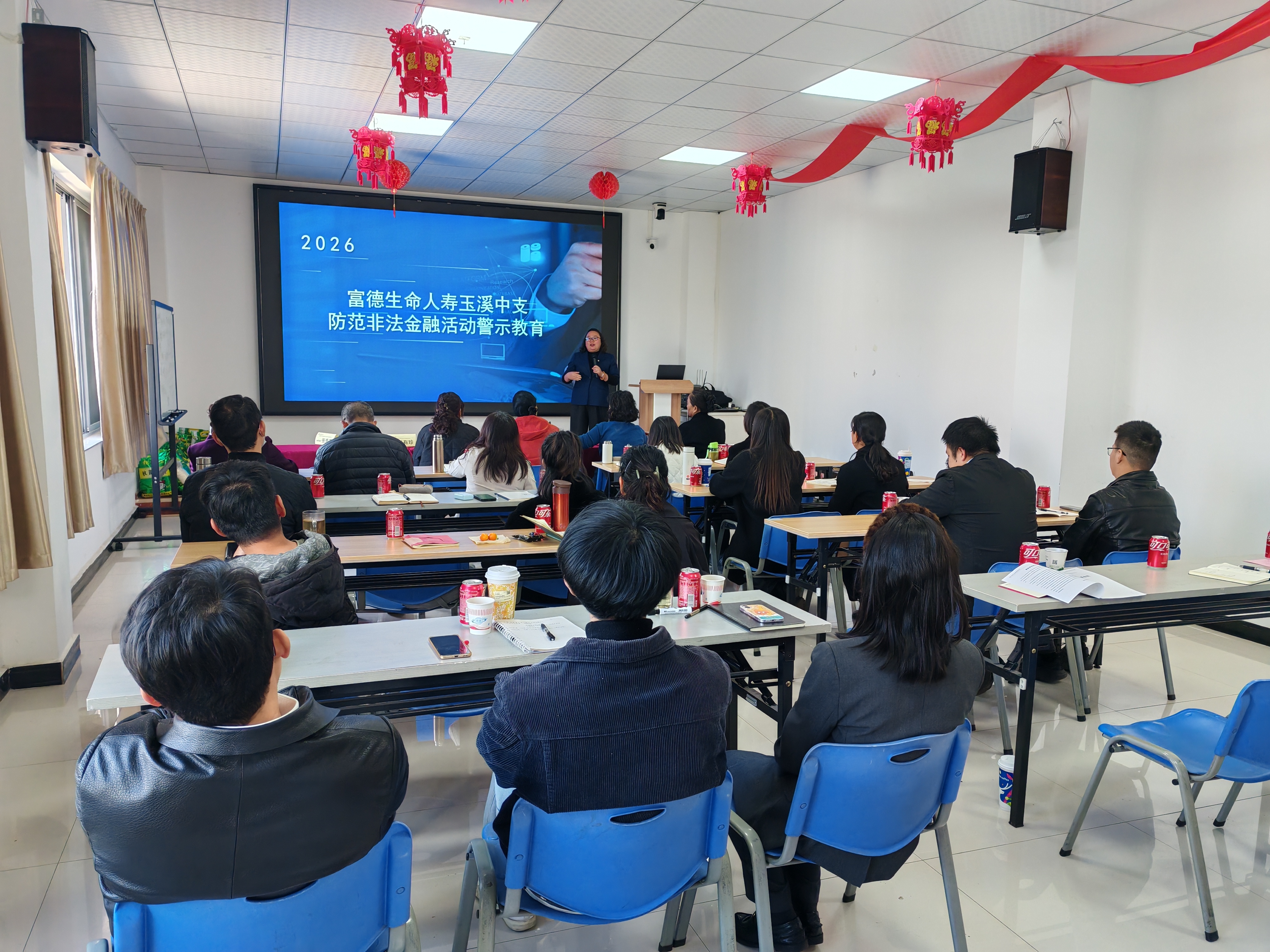 2026年2月2日,富德生命人寿玉溪中支的会议室内,一场面向全体内勤及营销骨干的深度警示教育培训正在进行。这场教育培训延续了玉溪中支此前在红塔区三角公园面向公众开展的“护好钱袋子 安心过大年”宣传活动的精神,将防线从外部公众延伸至内部员工。